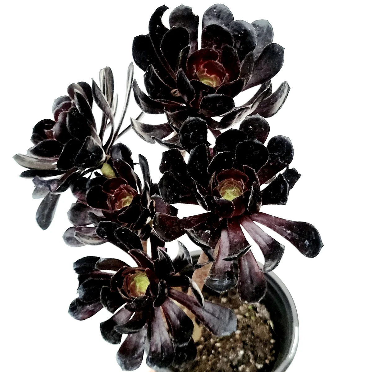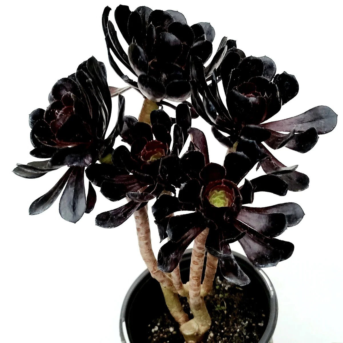 The Aeonium Black Rose succulent plant, scientifically known as Aeonium arboreum ‘Black Rose’, is a truly remarkable cultivated species belonging to the Crassulaceae family. Originating from the western Canary Islands in Morocco, this succulent is celebrated for its intensely dark, almost black, foliage. Its leaves are elegantly arranged in rosette-like cascades, creating a sense of solemnity and mystery that brings significant ornamental value to any plant collection. This particular aeonium is a shrubby plant that grows upright, developing branched, cylindrical, light brown old stems. The fleshy leaves are slightly thin, forming a distinctive 6-inch daisy-shaped rosette at the tips of the branches. The leaves are oblong-ovate or oblanceolate, with apices reaching approximately 2 inches long. The margins of the leaves are adorned with delicate white eyelash-like teeth, and their natural color is a striking blackish-purple. During winter, if light conditions are insufficient, the leaves may shift to a greenish-purple hue, adding another subtle dimension to its beauty. This succulent is a true showstopper, offering a unique aesthetic that complements modern and traditional decor alike.