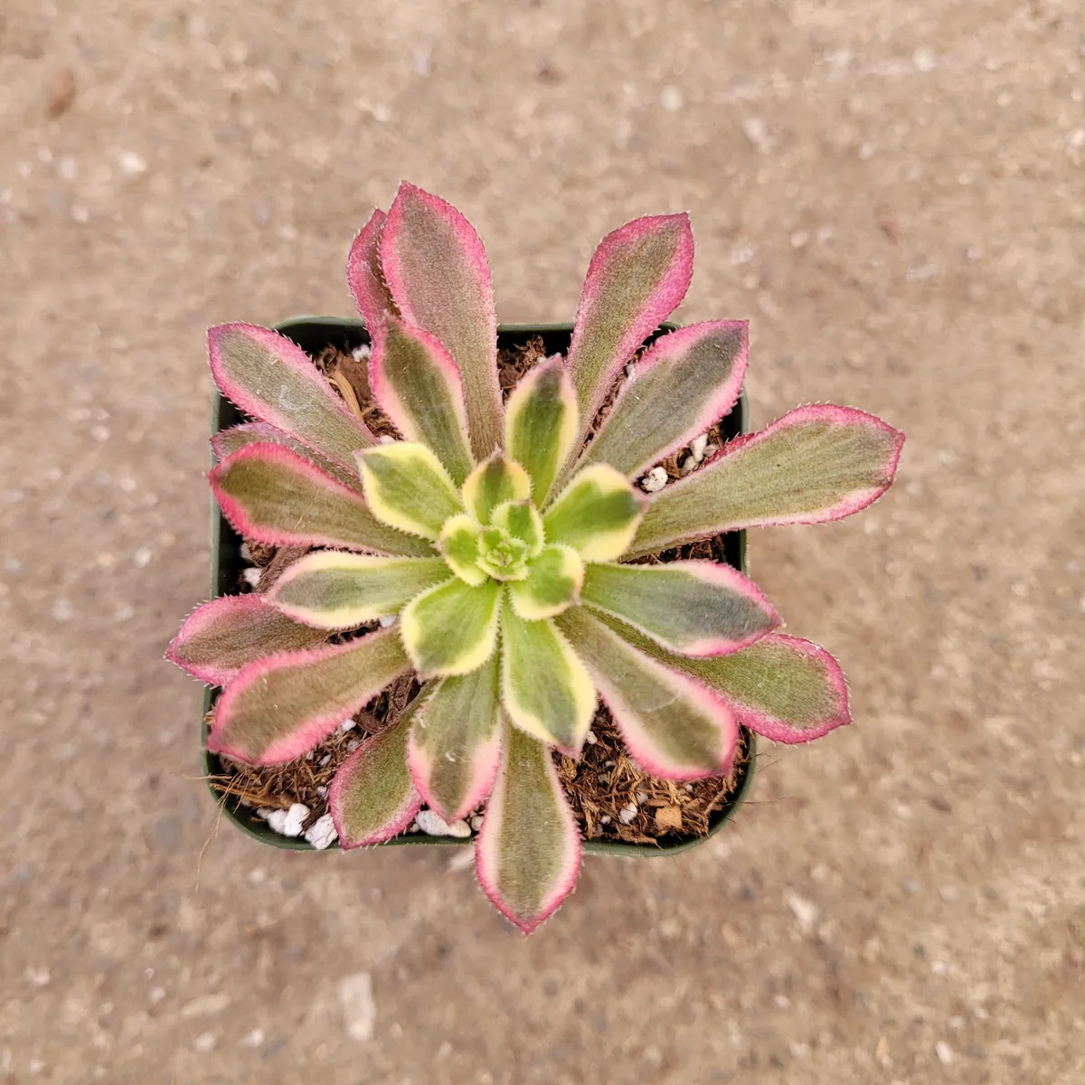 The ‘Mardi Gras’ is a cultivar of Aeonium, a genus of succulent plants native to the Canary Islands, known for their distinctive, waxy leaves that form a tight rosette. Unlike many succulents, Aeoniums have a more shrub-like growth habit, often developing woody stems over time. Their unique appearance and relatively straightforward care requirements make them a favored choice among succulent enthusiasts and novice gardeners alike. The potential for yellow flowers to emerge during the spring and summer months adds another layer of charm to this already stunning plant, further enhancing its appeal as a decorative and engaging botanical feature.
