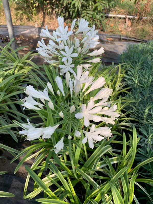 The Agapanthus Little White Bird is typically shipped as a healthy, established live plant in a 1 gallon pot, ready for immediate planting in your garden or a larger container. This cultivar is known for its compact and tidy growth habit. The attractive creamy white variegated foliage forms a neat clump, reaching a mature height of approximately 18 inches. During the summer blooming season, the striking pure white flower stalks will proudly stand above the foliage, extending up to 36 inches tall. This moderate size makes it an excellent choice for various landscaping applications, from border plantings to container gardening. Expect vigorous growth and abundant blooms in its first full season when properly cared for. This particular Agapanthus care is relatively simple, ensuring a thriving plant.