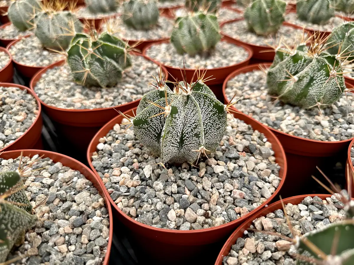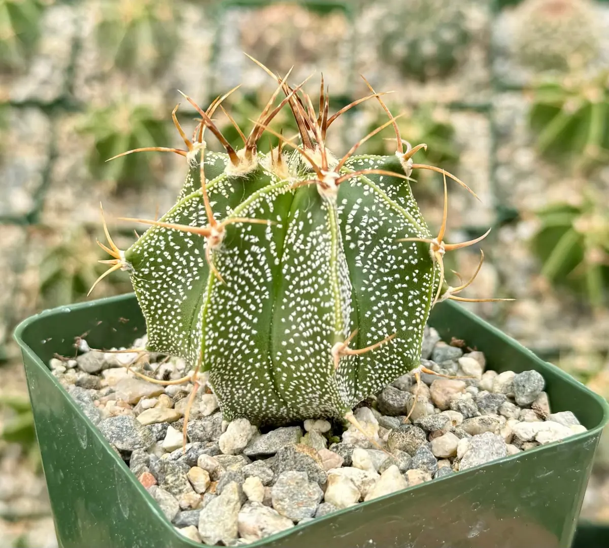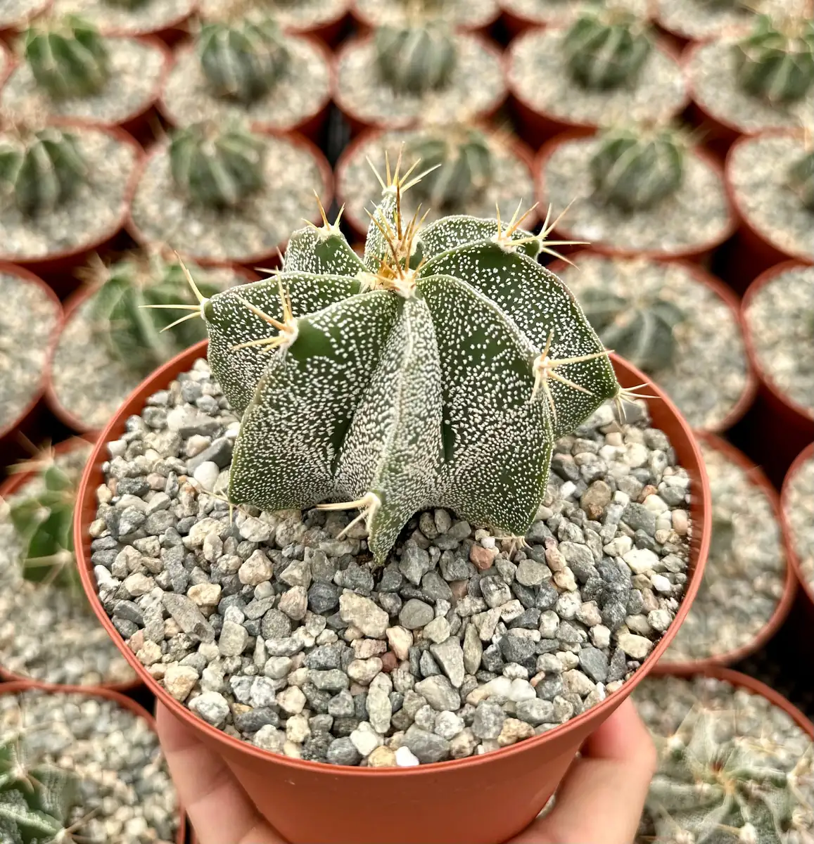 - Q: What size pot does it come in? A: Your astrophytum ornatum live plant will arrive in either a 3-inch or 6-inch nursery pot, depending on your selection. It will be well-rooted and ready for repotting if desired.
