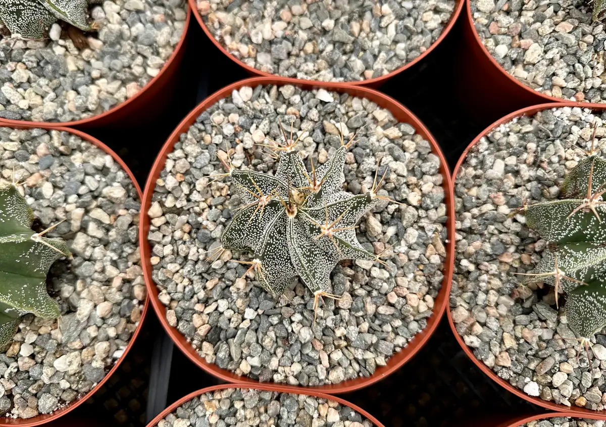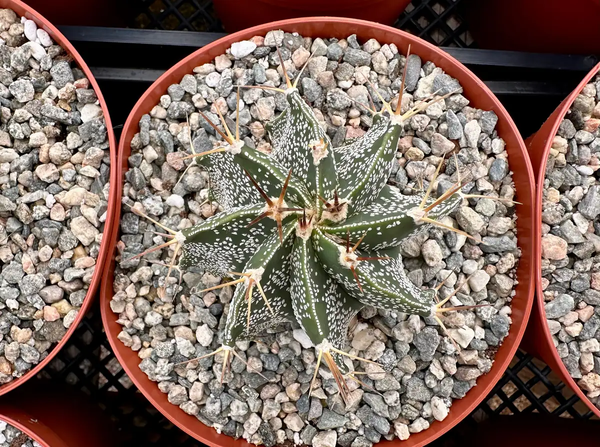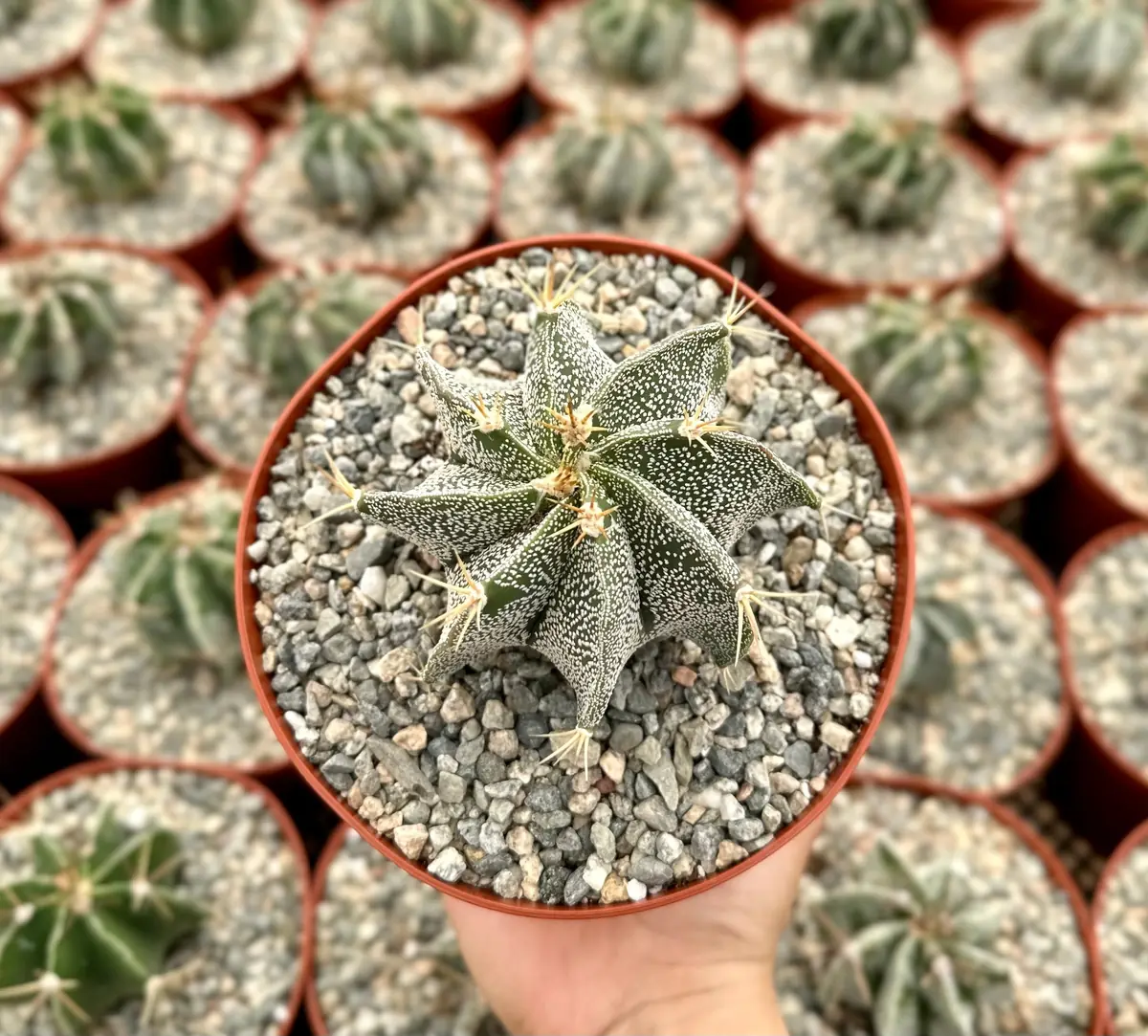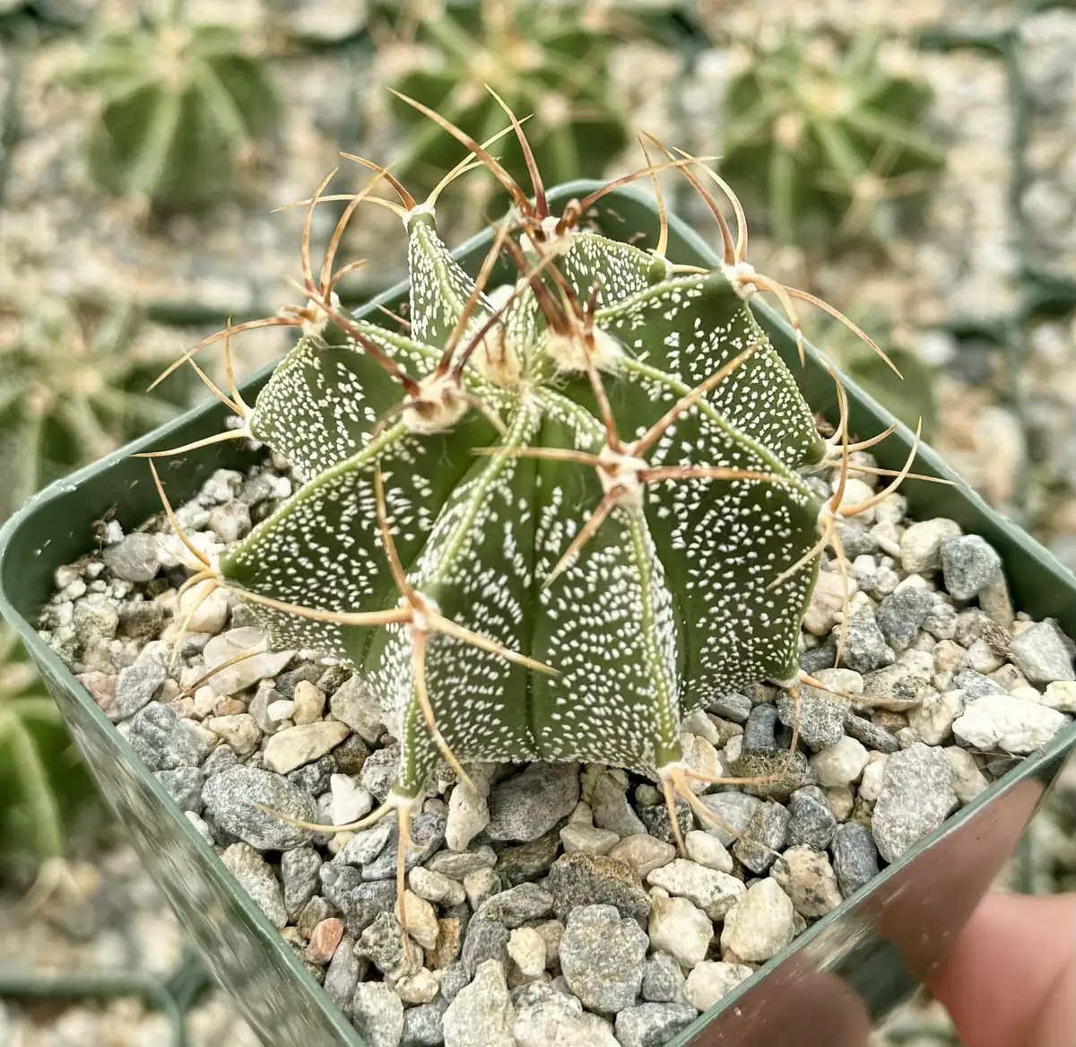 - Q: What size pot does it come in? A: Your astrophytum ornatum live plant will arrive in either a 3-inch or 6-inch nursery pot, depending on your selection. It will be well-rooted and ready for repotting if desired.