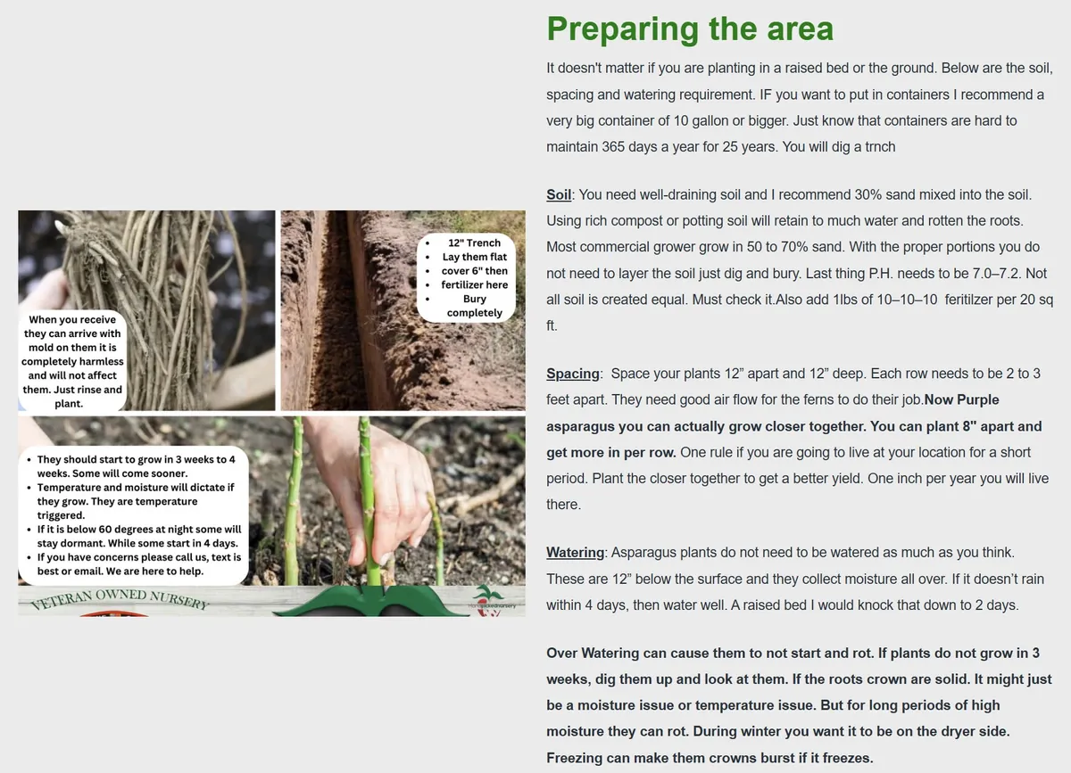 - Q: Is this plant easy to care for, especially for beginners? A: While establishing an asparagus patch requires some initial effort, once planted, asparagus is relatively low-maintenance. The 2 year asparagus crowns offer a head start, making it a manageable project for beginners with proper preparation.