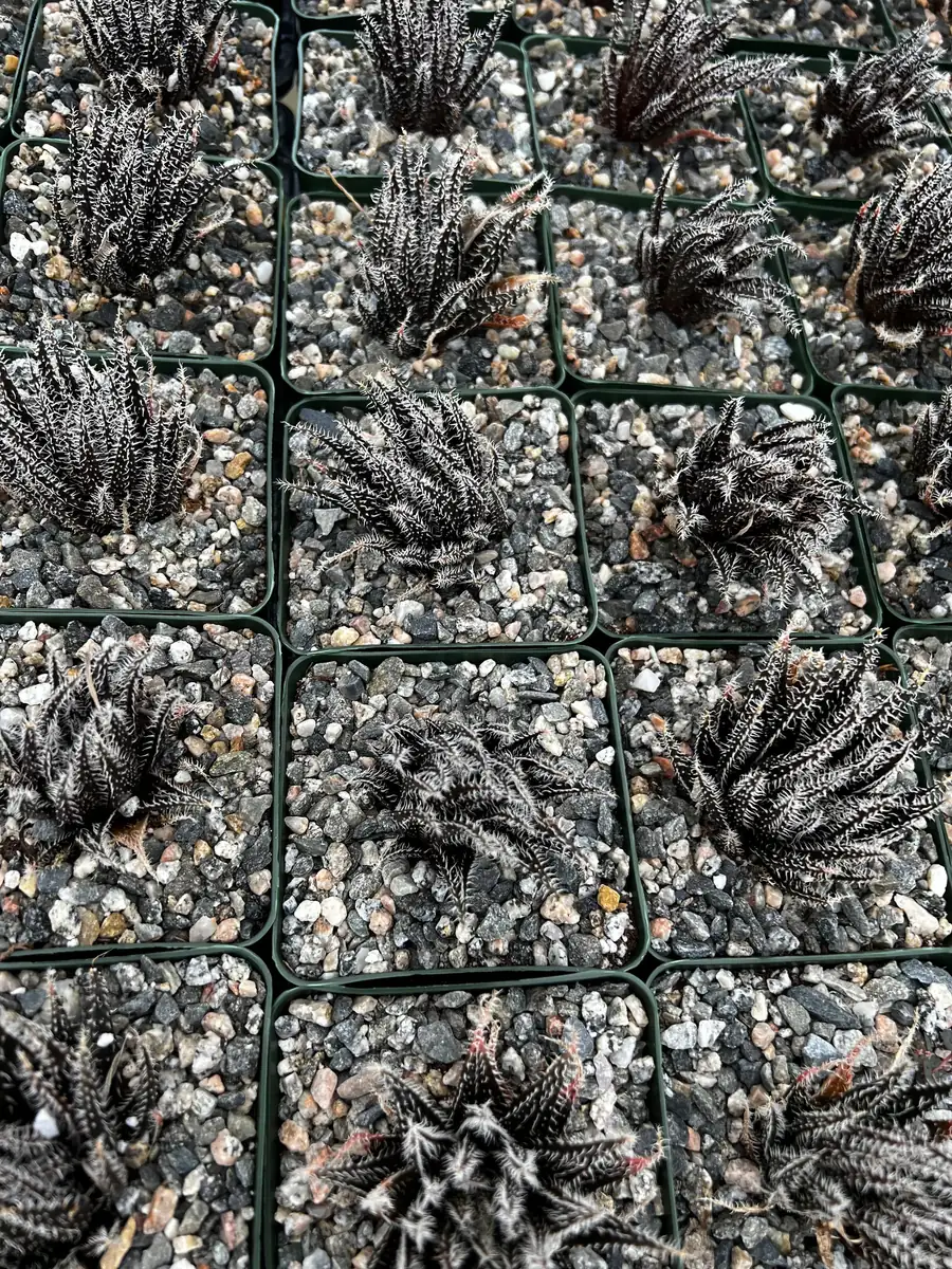 Introducing the captivating black haworthia aloe haworthioides, a truly remarkable and rare succulent plant that will elevate any plant collection. This unique hybrid combines the best features of Haworthia and Aloe, resulting in a mesmerizing specimen with deep, almost black, textured leaves. Its compact size and distinctive appearance make it a highly sought-after plant among succulent enthusiasts and beginners alike. Originating from the arid regions, this plant is adapted to thrive with minimal water, making it an excellent choice for those seeking a low-maintenance yet visually stunning addition to their home or office. The black haworthia aloe haworthioides offers an intriguing architectural form that stands out among more common houseplants.