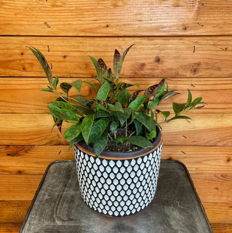 Bring an exotic touch to your home with the stunning black pagoda lipstick plant (Aeschynanthus longicaulis). This unique live houseplant is cherished for its dramatic, mosaic-patterned foliage and elegant cascading growth, making it a focal point in any indoor setting. As a young starter plant, it offers the joy of watching its development into a mature specimen. The leaves showcase bold dark-green markings on the underside, creating a truly distinctive appearance that elevates interior decor. When fully mature, the plant can produce fascinating tubular, ‘lipstick-like’ blooms, adding an extra layer of charm and intrigue. The aeschynanthus longicaulis is a tropical beauty that thrives indoors, offering a splash of vibrant greenery and unique texture.