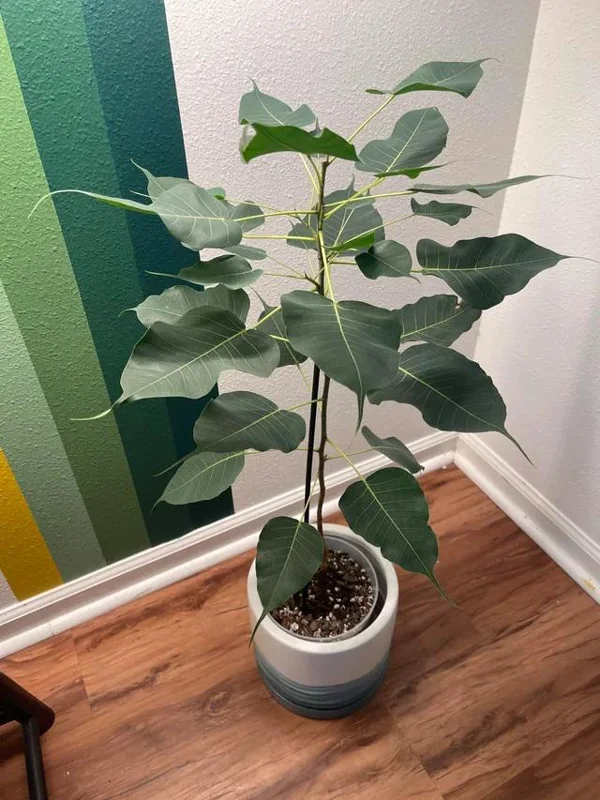 When it comes to watering, the sacred fig tree prefers consistently moist soil but dislikes being waterlogged. Allow the top inch or two of soil to dry out between waterings. During warmer months, you may need to water more frequently. Reduce watering in cooler temperatures or during the plant’s dormant period. Ensure your 7-gallon pot has excellent drainage to prevent root rot. A well-draining potting mix is crucial. Fertilize your Ficus Religiosa care during the growing season (spring and summer) with a balanced liquid fertilizer, diluted to half strength, every 2-4 weeks. Reduce or stop fertilization during fall and winter. This tree is sensitive to cold and thrives in temperatures above 50°F (10°C). If growing outdoors in a non-tropical climate, it will need to be brought indoors when temperatures drop.