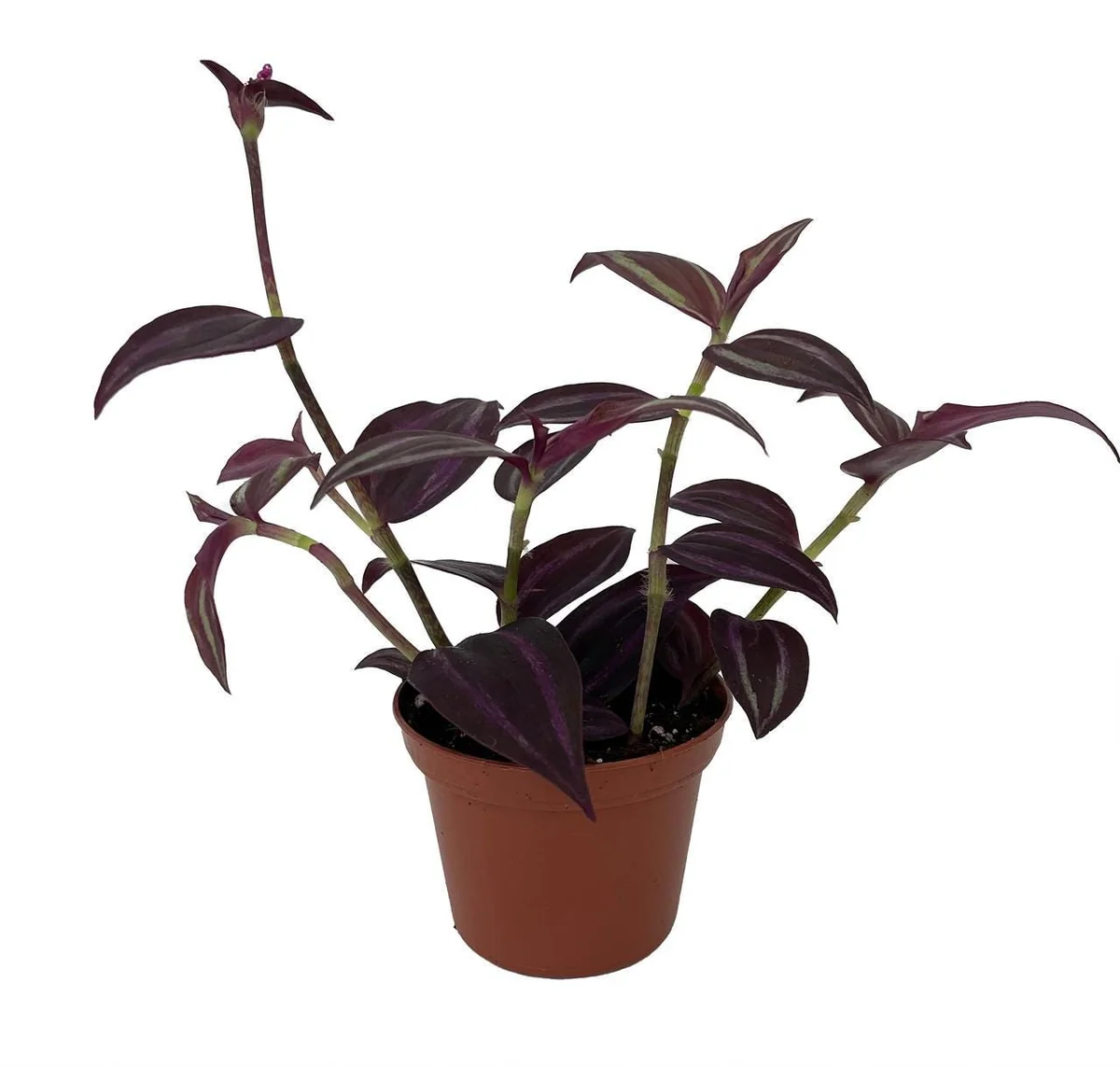 This offering is a healthy starter burgundy tradescantia live plant, shipped in a 2.5 inch nursery pot. At this stage, the plant typically has several established stems and a robust root system, ready for continued growth in your home. Tradescantia plants are known for their rapid growth rate, and with proper tradescantia plant care, you can expect its trailing stems to lengthen significantly over time, often reaching lengths of 12-24 inches or more within a year. The mature size of the plant depends largely on its growing conditions and whether it is regularly pruned to maintain a compact shape or allowed to trail freely.