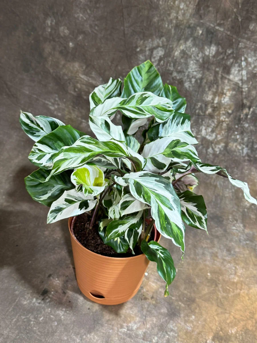 Introduce a touch of sophisticated tropical beauty to your indoor sanctuary with the Calathea Stella Fusion White live plant. This captivating houseplant, often simply referred to as Calathea ‘Stella’, is renowned for its strikingly beautiful white variegated leaves that instantly elevate any space. Each leaf is a natural work of art, displaying intricate patterns of rich green accented with elegant silvery and dark markings, creating a dynamic visual appeal. Unlike many plants, the Calathea ‘Stella’ is celebrated for its unique characteristic of moving its leaves in response to light, earning it the nickname ‘prayer plant’ – a truly mesmerizing display that adds dynamic serenity to your plant collection. This particular offering provides a healthy, thriving specimen in a convenient 6-inch decorative pot, ready to adorn your tabletops, shelves, or shaded corners. As a live plant, it brings natural vibrancy and a sense of calm to modern and boho-style homes, making it a perfect focal point or an exquisite addition to an existing collection.