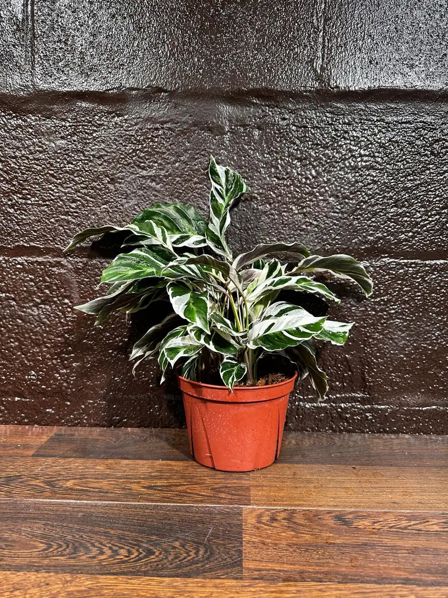 This offering is for a Calathea White Fusion live plant provided in a 6 inch nursery pot, ready to be enjoyed or repotted into a decorative container. At the time of shipment, plants typically stand between 8-12 inches tall from the base of the pot, with a spread of similar dimensions, showcasing its compact and bushy growth habit. The plant is well-established with a healthy root system, ensuring a smooth transition to its new home. Its growth rate is moderate, allowing you to appreciate its development over time. With proper indoor Calathea plant care, it will gradually expand its beautiful variegated foliage, adding continuous visual interest. Expect its vibrant patterns to become more pronounced as it matures, making it a dynamic addition to your collection.