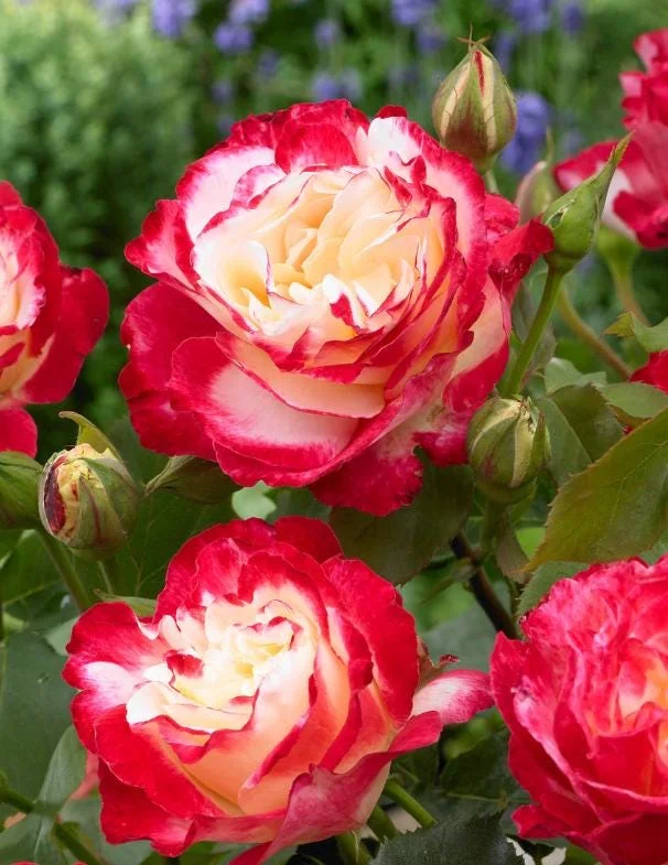 This offering includes a Double Delight Rose live plant, which will arrive as a starter plant, typically measuring 5-7 inches tall. These young plants are carefully nurtured to ensure a healthy start in your garden. Upon planting, with proper care, this Hybrid Tea Rose can reach a mature height of approximately one meter (around 3 feet) and spread similarly, creating a substantial and attractive focal point. The large double blooms are a hallmark of this variety, showcasing their unique creamy-white petals with striking cherry-red edges. Expect these vibrant flowers to begin their display from July and continue generously through September, providing a long season of enjoyment. The plant ships without a pot to minimize shipping stress and prepare it for direct planting in your garden bed or a larger container. These creamy white roses are known for their strong, captivating fragrance.