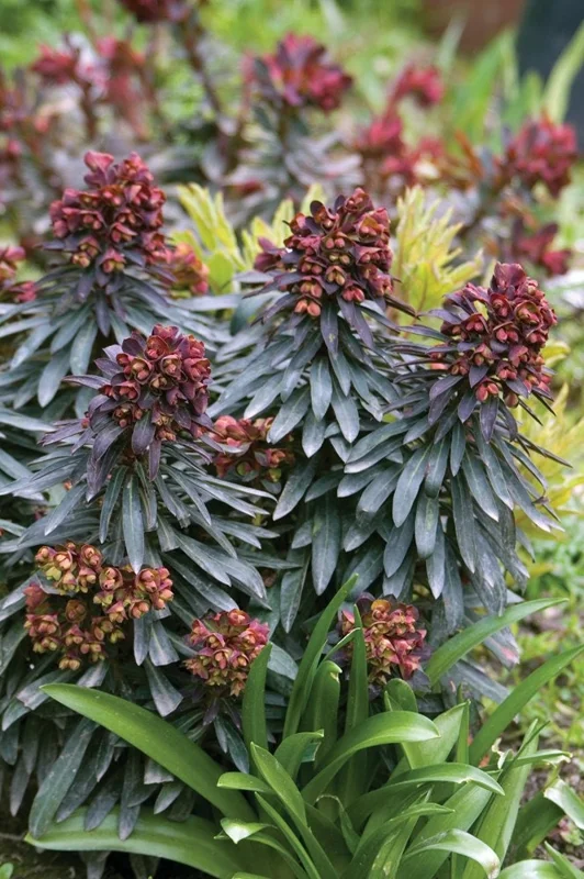 The Euphorbia Blackbird live plant is generally hardy and can tolerate a range of temperatures. It is well-suited for USDA hardiness zones 6-9. In colder zones, it may benefit from winter protection or can be grown as an annual. Fertilization is usually not heavily required; a light application of a balanced, slow-release fertilizer in early spring is sufficient. Pruning should be done carefully, as the milky sap can be irritating to skin and eyes. Wear gloves and protective eyewear. Prune back spent flower stalks to encourage new growth and maintain a tidy appearance. Watch for common issues like powdery mildew in humid conditions or spider mites, though Euphorbias are generally pest-resistant.