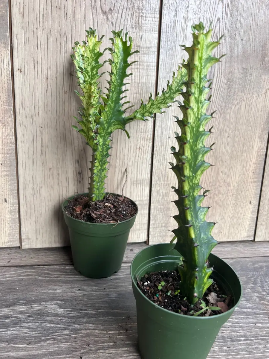 The Euphorbia Lactea Variegated live plant you will receive is presented in a 4″ pot, making it a perfect size for immediate display on windowsills, desks, or as part of a larger succulent arrangement. At this stage, the plant exhibits its characteristic upright growth and striking variegation, typically ranging from 6-10 inches in height above the pot. This particular specimen is known for its moderate growth rate, gradually developing into a more substantial, multi-branched form over several years. It is shipped as a healthy, established plant, similar to the pictures, ensuring a strong start in its new environment. Expect it to continue to develop its unique architectural structure and vibrant coloring, becoming a focal point in any collection. This beautiful false cactus plant is a long-lived succulent that will bring years of enjoyment with proper care.