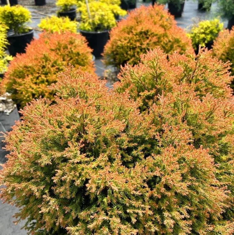 The Fire Chief Globe Arborvitae, often simply referred to as red gold arborvitae, is a cultivar known for its dense, spherical growth habit and eye-catching chromatic display. Its fine-textured leaves create a soft, inviting appearance, while its bold colors provide excellent contrast against green landscapes or snowy backdrops. Whether used as a focal point, in mass plantings, or as part of a mixed border, this plant consistently delivers visual interest. It’s a living jewel that enriches the aesthetic appeal of any outdoor space, providing continuous beauty with little effort, making it an excellent low maintenance arborvitae.
