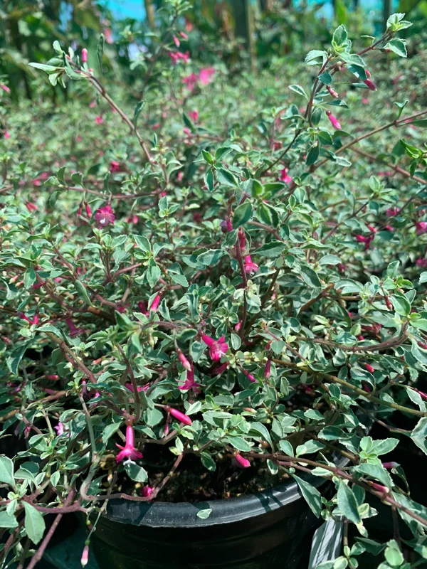 Introduce a touch of sophisticated charm to your garden with the exquisite fuchsia thymifolia variegata. This stunning live plant, often referred to simply as variegated fuchsia, is celebrated for its unique foliage and delicate, bell-shaped flowers that grace your garden from summer through fall. Perfect for adding visual interest to shaded areas, this fuchsia variety offers a refreshing alternative to traditional garden plants. Its distinctive leaves, adorned with creamy white and green patterns, provide year-round beauty even when not in bloom. Originating from Mexico, Fuchsia thymifolia is a species known for its small leaves and graceful habit, and the ‘Variegata’ cultivar enhances these qualities with its eye-catching variegation. This flowering fuchsia shrub is a delightful addition for both seasoned gardeners and those looking to enhance their outdoor spaces with something truly special.
