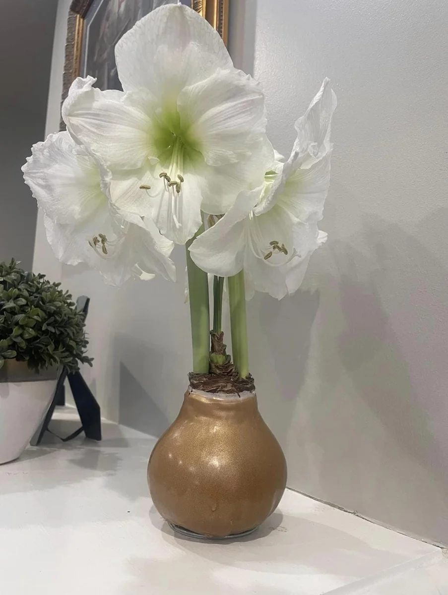- Stunning Visual Appeal: The pristine white flowers of the Denver White Amaryllis combined with the radiant gold wax coating create a luxurious and eye-catching display, perfect for holiday centerpieces or as an elegant accent in any room. The contrast is truly captivating.