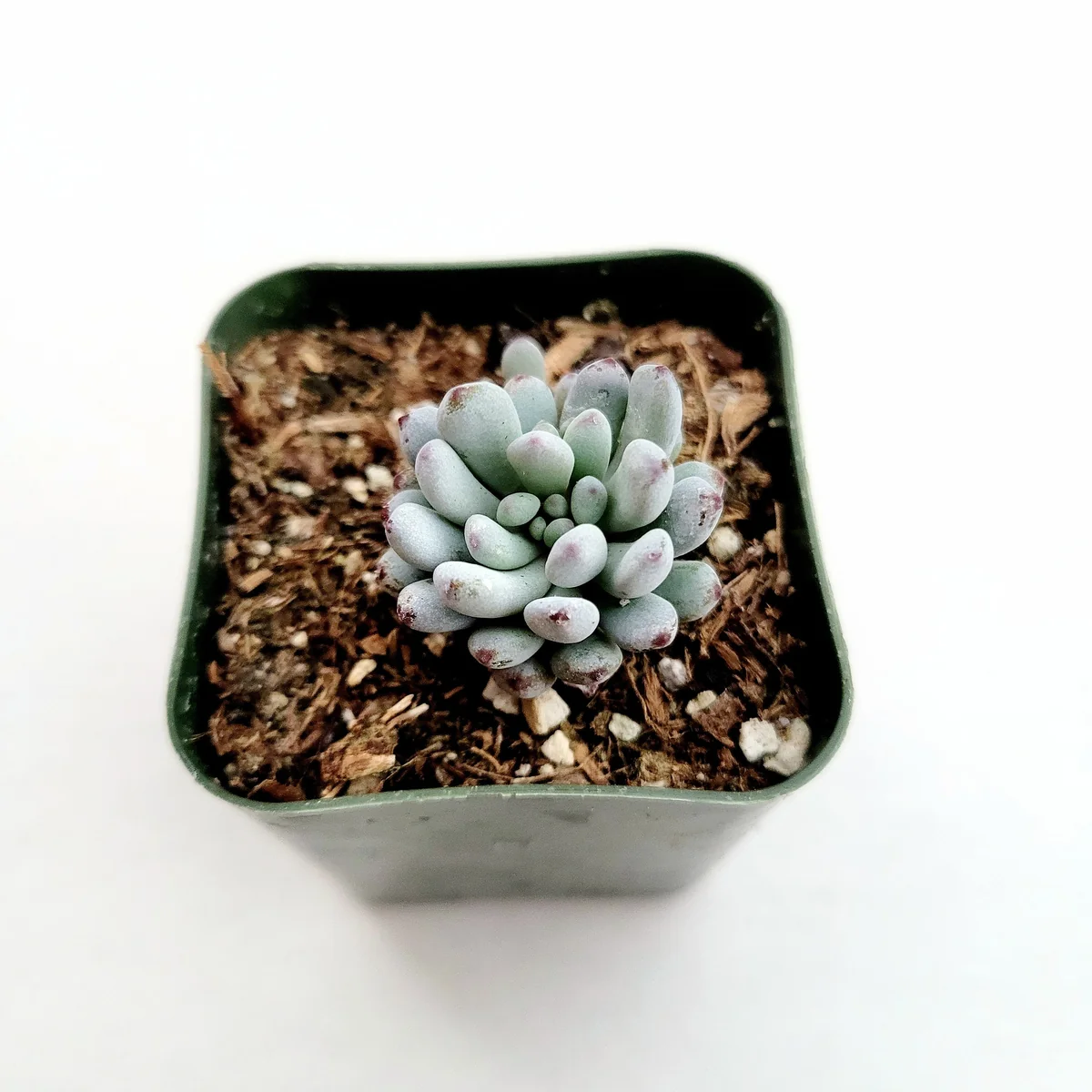 The graptopetalum bluebean succulent is typically a low-growing variety, forming compact rosettes that can spread over time. When mature, individual rosettes can reach approximately 2-4 inches in diameter, with the plant forming a dense cluster. This makes it an ideal plant for small pots, terrariums, or as a component in mixed succulent arrangements. Plants are commonly available in 2-inch or 4-inch nursery pots. Younger plants in 2-inch pots are often shipped with their soil and pot, while larger plants, such as those in 4-inch sizes, may be shipped bare-root to ensure their health during transit and allow for easier acclimation to new environments. You can expect a growth rate that is moderate, allowing you to enjoy its development without it quickly outgrowing its space. The ‘Bluebean’ is known for its robust nature and will gradually fill its container with its charming, bean-like foliage.
