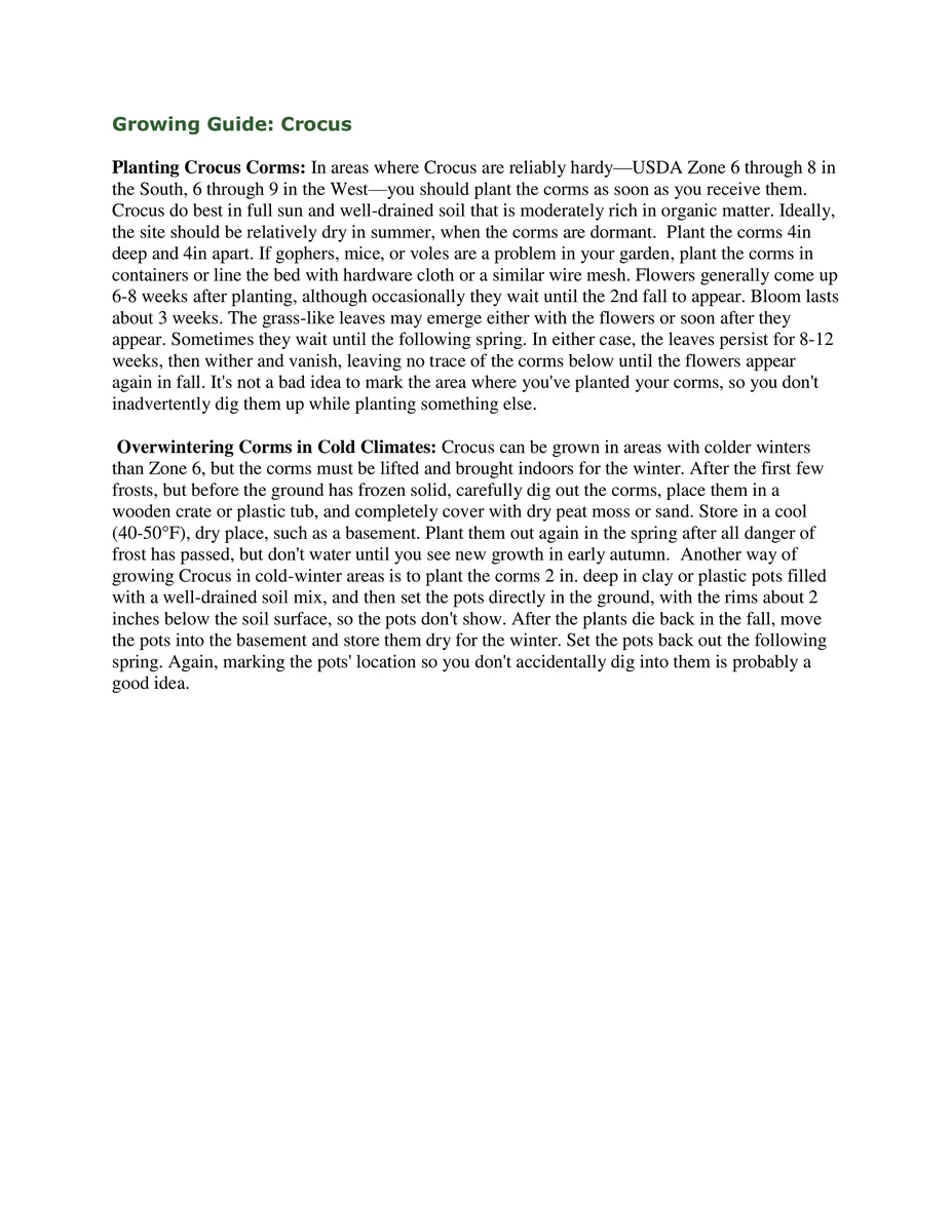 - Q: How long until it blooms? A: After fall planting, these crocus bulbs will typically bloom very early the following spring, often within the first few weeks after winter’s thaw.