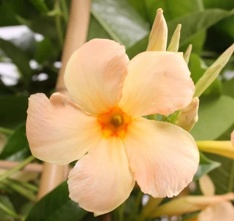 Water your Mandevilla consistently, aiming for moist but not soggy soil. Overwatering can lead to root rot, so ensure excellent drainage. Allow the top inch of soil to dry out slightly between waterings. The plant’s tuberous roots help it tolerate short periods of drought, but regular watering promotes healthier growth and more flowers. Use a well-draining potting mix if grown in containers, or ensure your garden soil is not heavy clay. Fertilize every 2-4 weeks during the growing season with a balanced liquid fertilizer to encourage continuous blooming. Provide support such as a trellis, stakes, or fencing for your tropical flowering vine to climb, guiding its growth for an attractive display. Pruning can be done in late winter or early spring to maintain shape and encourage bushier growth.