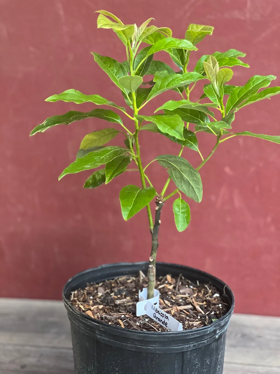 Mexicola Grande trees have a vigorous, upright, and spreading growth habit. The leaves also possess a pleasant anise aroma.Mexicola Grande is the only avocado cultivar with edible skin and leaves. The leaves are used to impart a unique flavor in Mexican recipes.