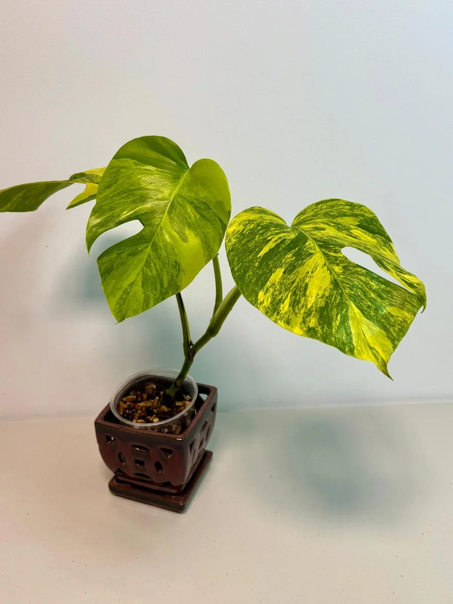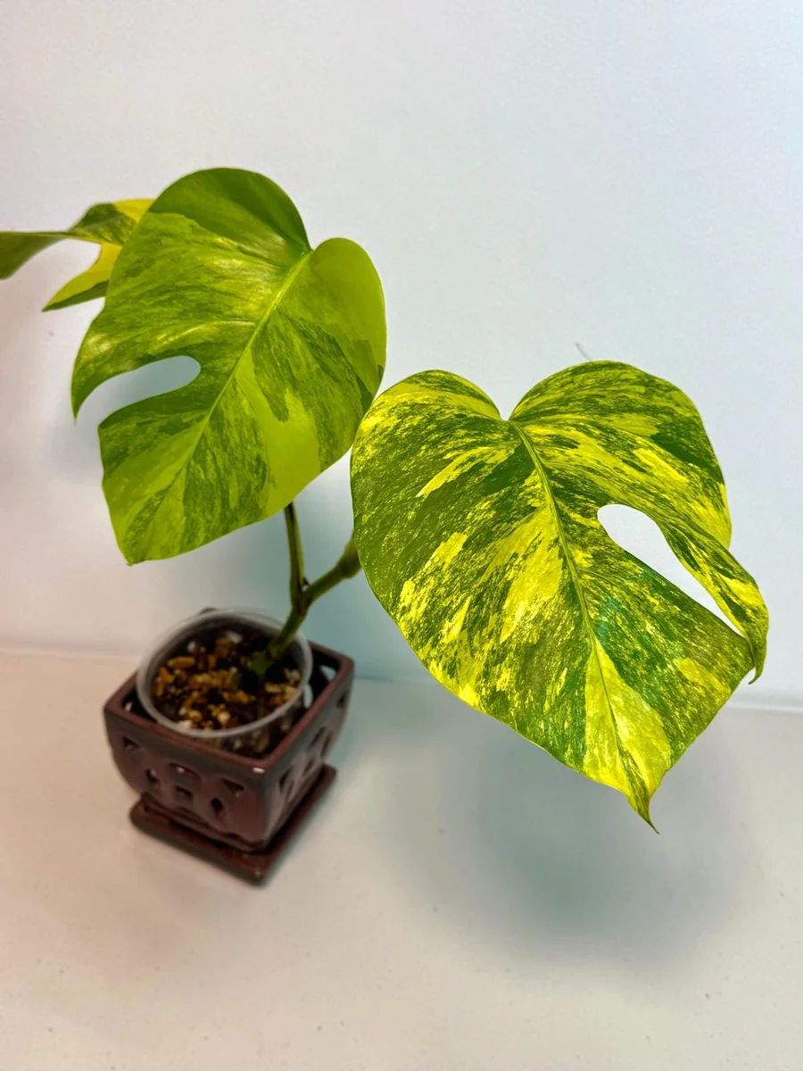 The Monstera Aurea Variegated Borsigiana is more than just a plant; it’s a statement piece. Its dramatic foliage and impressive size, as it matures, command attention and become a focal point in any room. Originating from tropical climates, this plant thrives indoors with proper attention to its specific needs, bringing a lush, jungle-like feel to your living space. Its rarity contributes to its desirability, making it a special addition to any collection. Whether you are a seasoned plant parent or looking to expand your horizons with a truly unique specimen, the Monstera Aurea Variegiana Borsigiana offers unparalleled beauty and a rewarding growing experience.