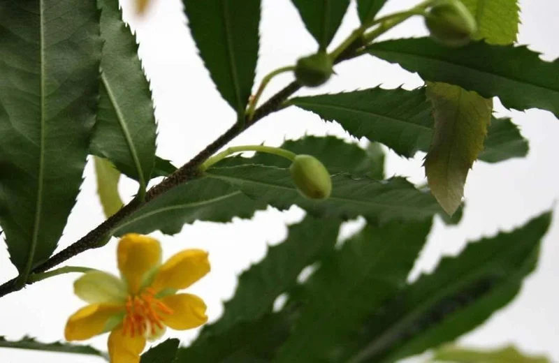 Temperature and Hardiness: The Mickey Mouse bush is best suited for USDA hardiness zones 9-11. It can tolerate light frosts but may suffer damage in prolonged freezing temperatures. In colder zones, it can be grown in a container and brought indoors or protected during winter. The leaves with sharp teeth are long and narrow, unlike another variety, Ochna integerrima, which leaves are more oval and smooth, highlighting its unique characteristics.