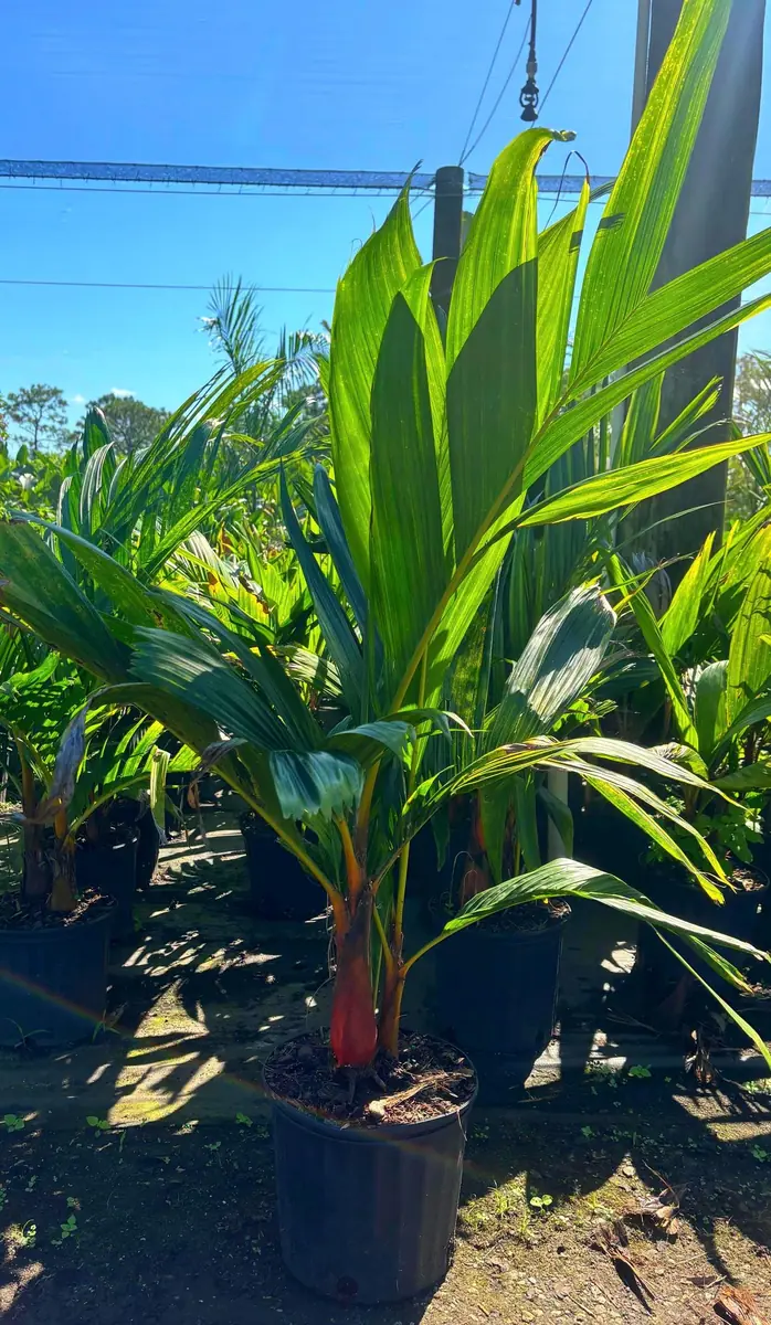 The distinct red crownshaft is already visible on mature specimens, providing a striking contrast to the broad, green fronds. This exotic palm tree will continue to develop its rich coloration as it grows. It ships as a fully rooted, live plant, carefully packaged to minimize stress during transit. Expect a long-lived and beautiful addition to your home or garden, offering a consistent tropical presence. Repotting will be necessary every few years as the plant outgrows its container, moving it to a pot that is only slightly larger to avoid overwatering issues. This tropical houseplant will become a beloved part of your living space for many seasons.