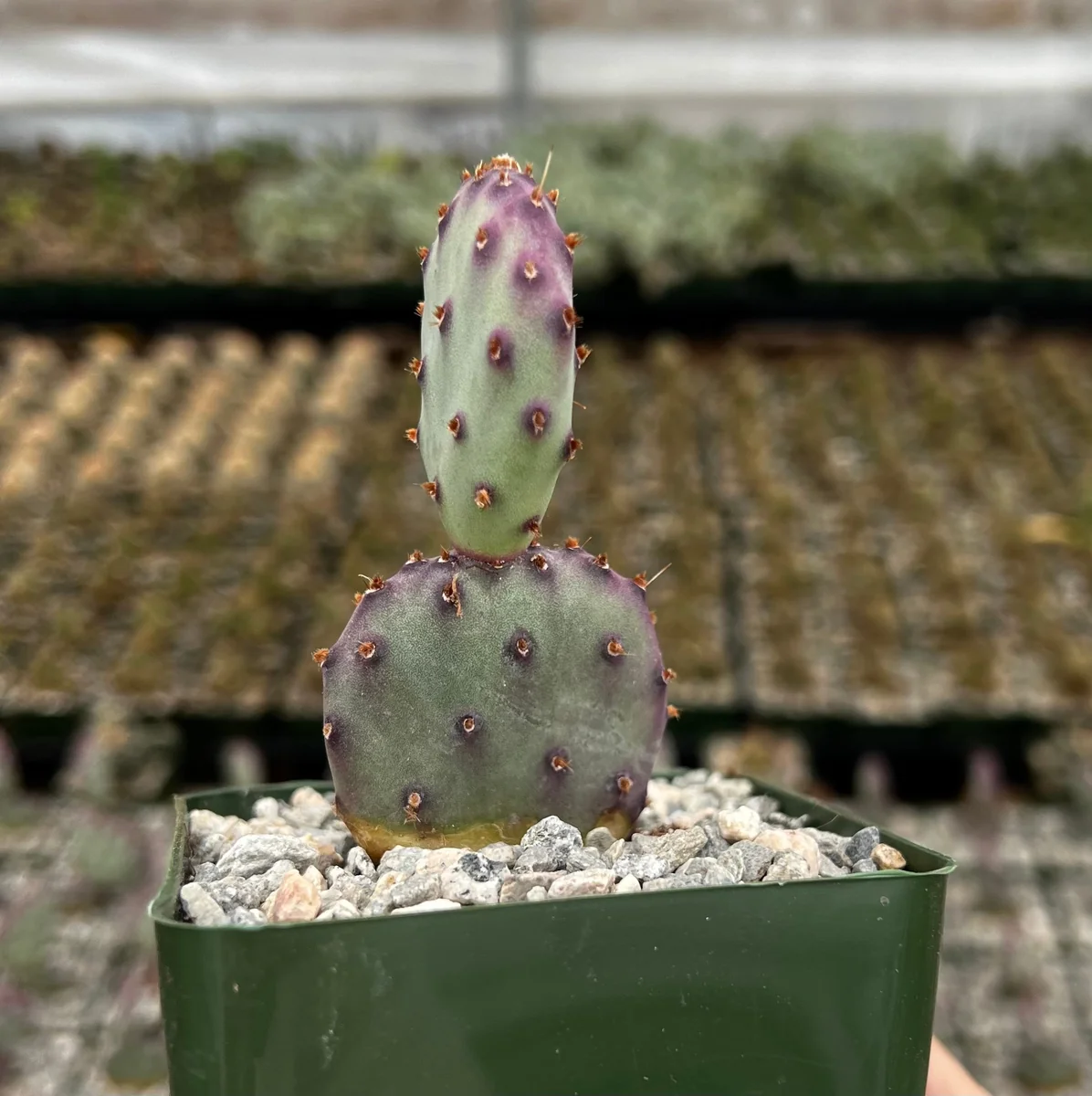 - Q: What condition will the cactus arrive in? A: Your purple prickly pear cactus will arrive as a healthy, well-rooted live plant in a 4-inch nursery pot, carefully packaged to ensure its safe journey to you.