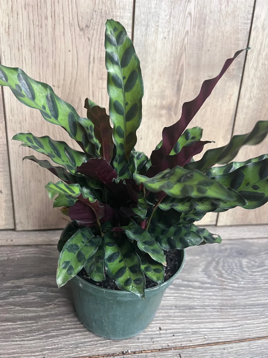 Introduce a touch of exotic elegance to your home with the stunning Rattlesnake Plant live (Calathea lancifolia). This captivating Calathea houseplant is renowned for its distinctive foliage, showcasing long, slender leaves with intricate dark green spots on a lighter green background. The undersides of its leaves boast a rich, deep purple hue, adding to its visual appeal. As a member of the Prayer Plant family, the leaves of the Calathea lancifolia indoor plant will fold upwards at night, resembling hands clasped in prayer, and unfurl again in the morning. This particular specimen comes in a 6-inch pot, ready to thrive in its new environment. Perfect for adding a vibrant, living accent to any room, the Rattlesnake Plant live is a true conversation starter and a favorite among plant enthusiasts.