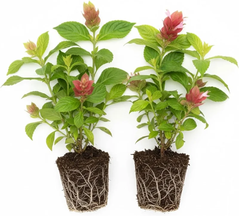 This offering includes two individual red shrimp live plant starter plants, each standing approximately 4-8 inches tall from the base of the root ball to the top of the foliage. These plants are shipped well-rooted and come in soil without a pot, carefully packaged to ensure safe arrival. Expect a mature height of 3-4 feet and a spread of 3-5 feet when planted in ideal conditions. The growth rate is relatively fast, allowing these plants to quickly reach their mature size and begin producing their characteristic red, shrimp-like flowers. While they can bloom nearly year-round in warm climates with proper care, the main expected blooming period is from spring to fall. During late fall and winter, plants may arrive with fewer leaves or no blooms, which is a natural dormant phase. These plants are ideal for creating an immediate impact in your garden or containers.