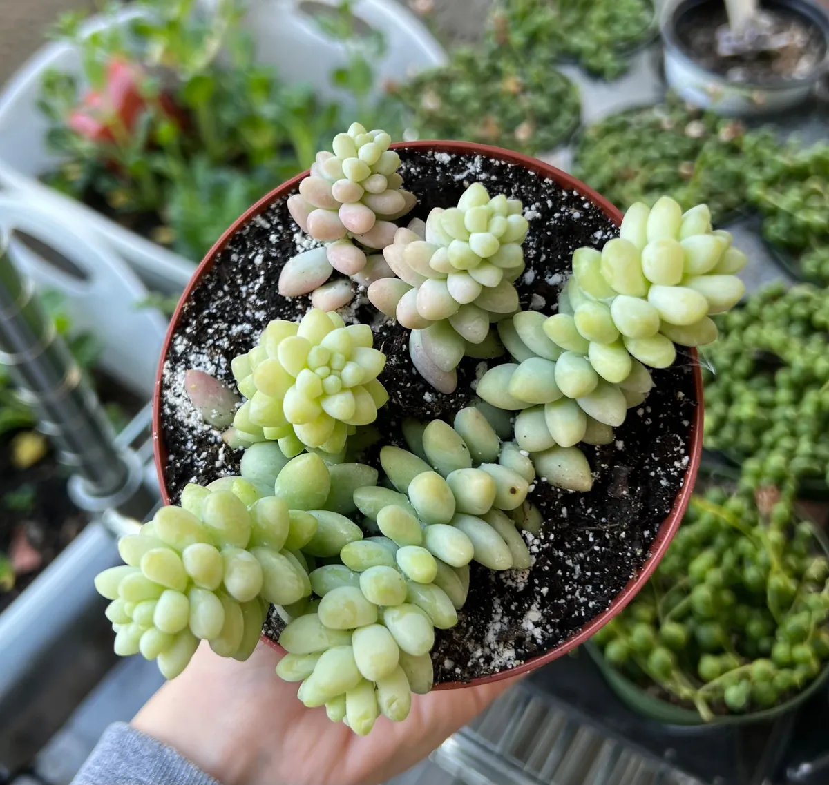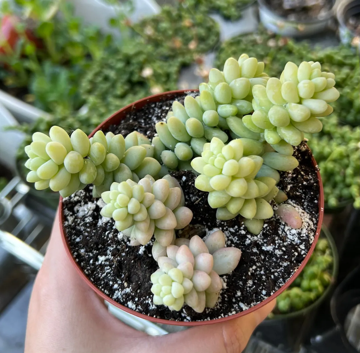 Soil Type and Drainage Requirements: This plant requires a well-draining soil mix to prevent root rot. A specialized succulent or cactus potting mix is ideal. You can also create your own by mixing regular potting soil with perlite or coarse sand (50/50 ratio) to improve drainage. Ensure your pot has drainage holes. The waxy leaves of the sedum burrito live plant help protect it from moisture loss, but sitting in wet soil will quickly lead to issues.