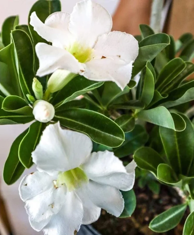 - Stunning Aesthetic Appeal: Boasts a thick, sculptural caudex and glossy dark green leaves, providing a natural bonsai-like artistry that enhances any display. The pure white trumpet-shaped flowers with a lime throat add an elegant contrast, making your white desert rose live plant a focal point.