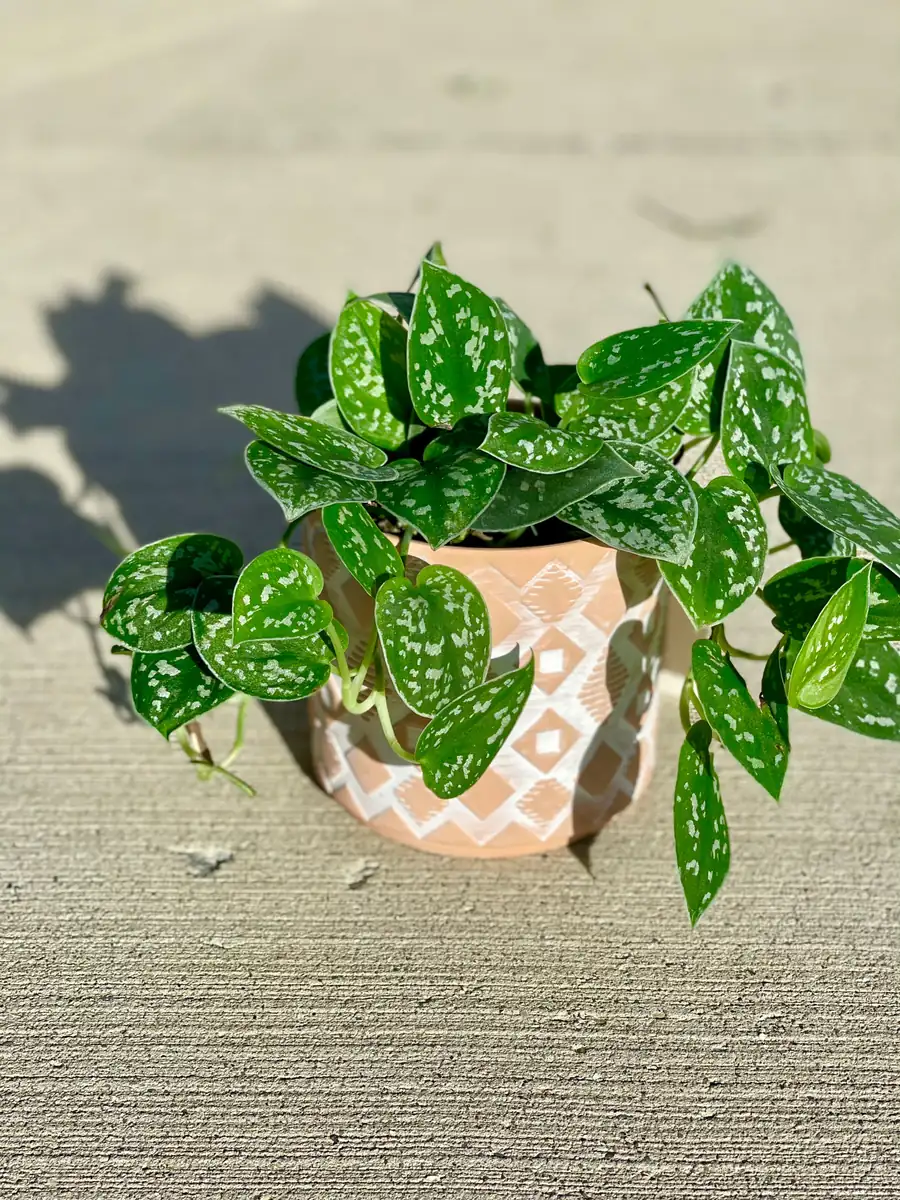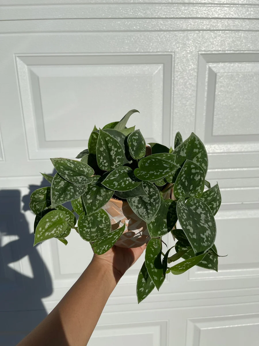 The leaves of the scindapsus pictus are heart-shaped, typically ranging from 2 to 4 inches in length, and feature the distinctive velvety texture with shimmering silver variegation. This plant ships in a plastic nursery pot, which is designed to keep the roots secure and moist during transit. Please note that the decorative ceramic pot shown in some images is not included. Expect your plant to arrive healthy and ready to be placed in its new home, offering immediate visual appeal. With proper care, your silver satin pothos will continue to grow and develop its beautiful trailing vines and stunning foliage, becoming a focal point in your indoor garden.