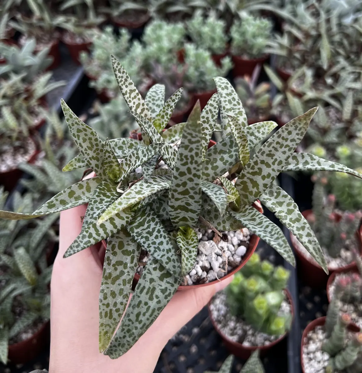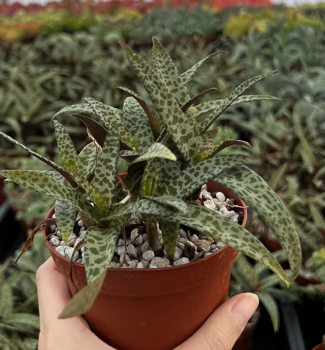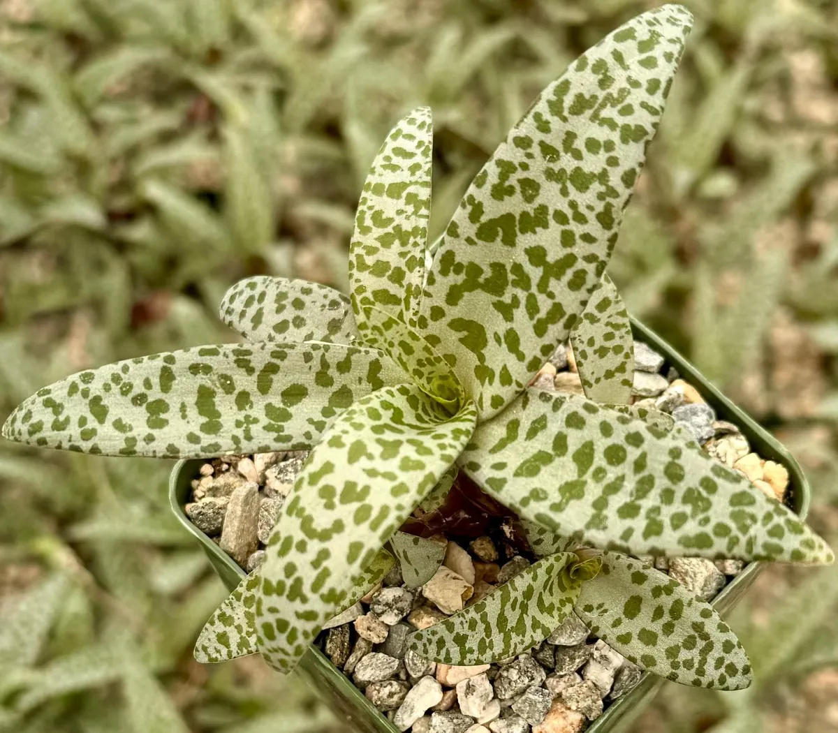 Your leopard lily houseplant will arrive established in its container, minimizing transplant shock. The leaves are typically long, narrow, and fleshy, forming an attractive rosette. Expect to see the characteristic silver-grey color with dark green spots, providing a unique texture and visual appeal. This plant is mature enough to display its distinctive foliage and has the potential to produce its delicate pink or white blooms in due course, adding an extra layer of beauty to your collection.