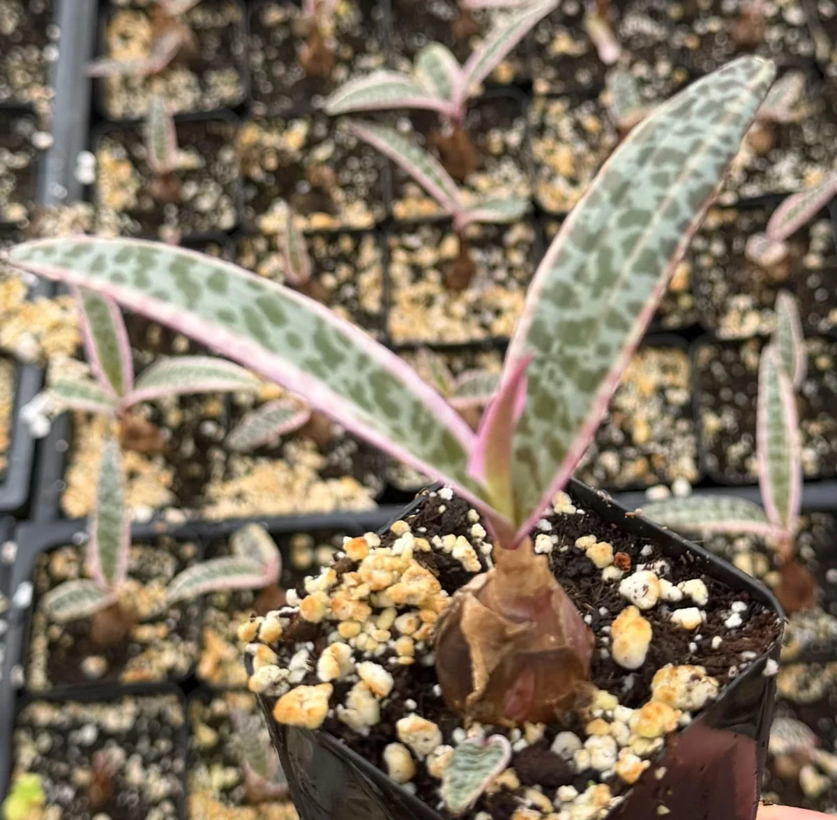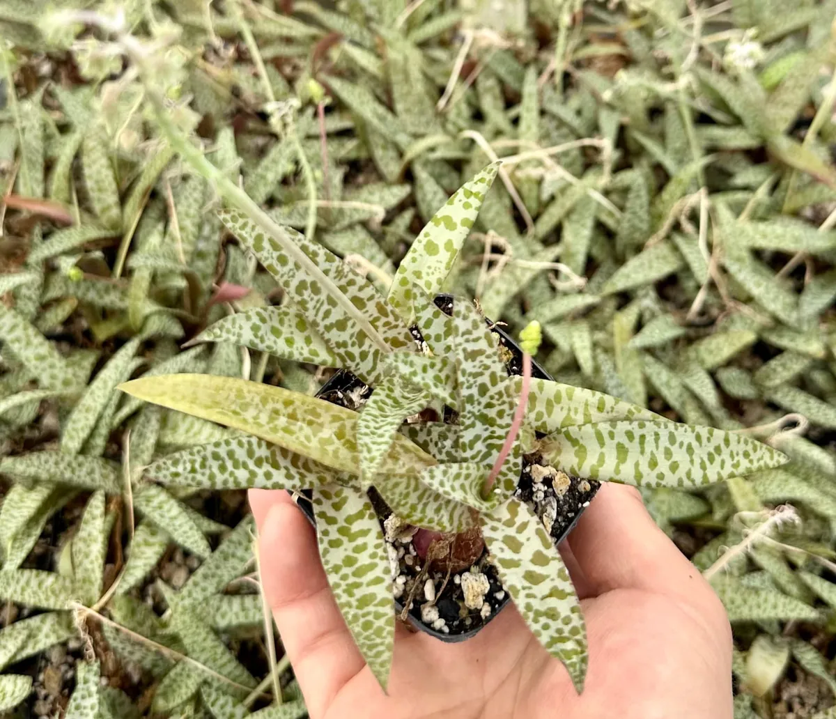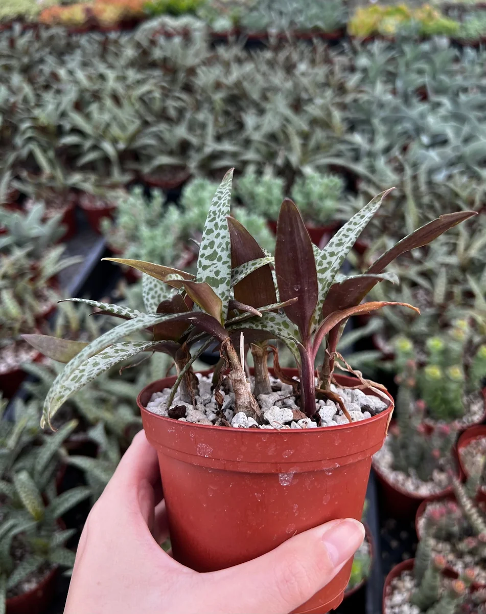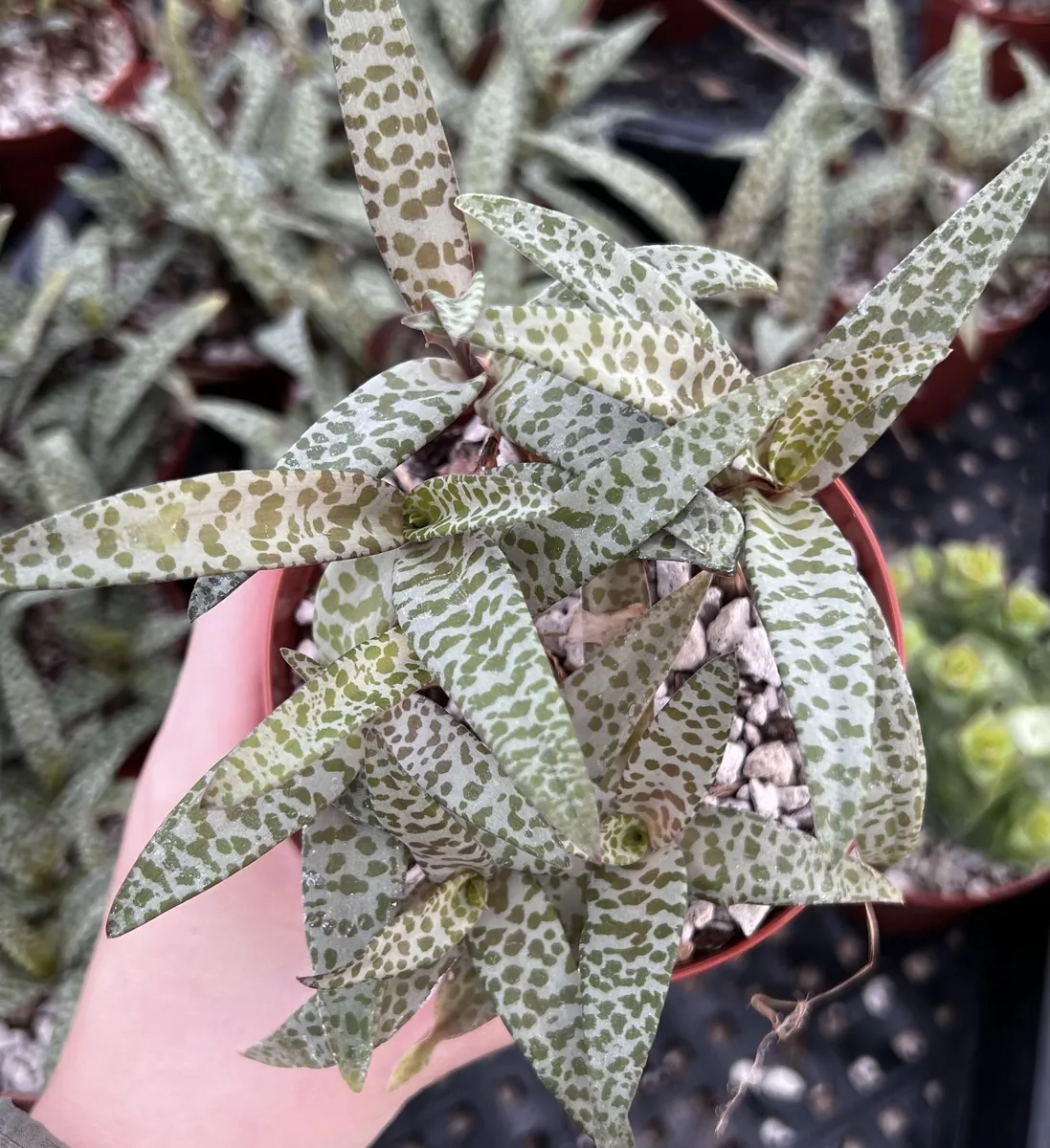 Your leopard lily houseplant will arrive established in its container, minimizing transplant shock. The leaves are typically long, narrow, and fleshy, forming an attractive rosette. Expect to see the characteristic silver-grey color with dark green spots, providing a unique texture and visual appeal. This plant is mature enough to display its distinctive foliage and has the potential to produce its delicate pink or white blooms in due course, adding an extra layer of beauty to your collection.