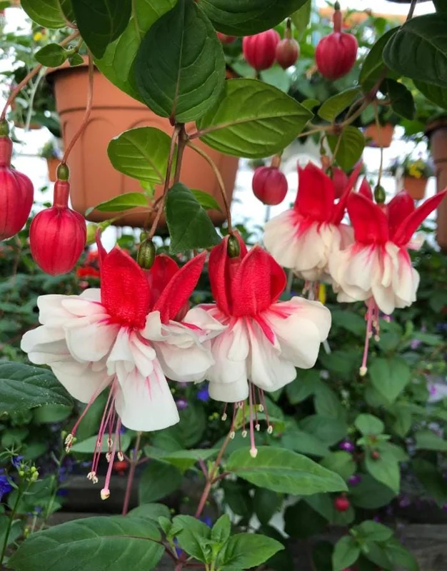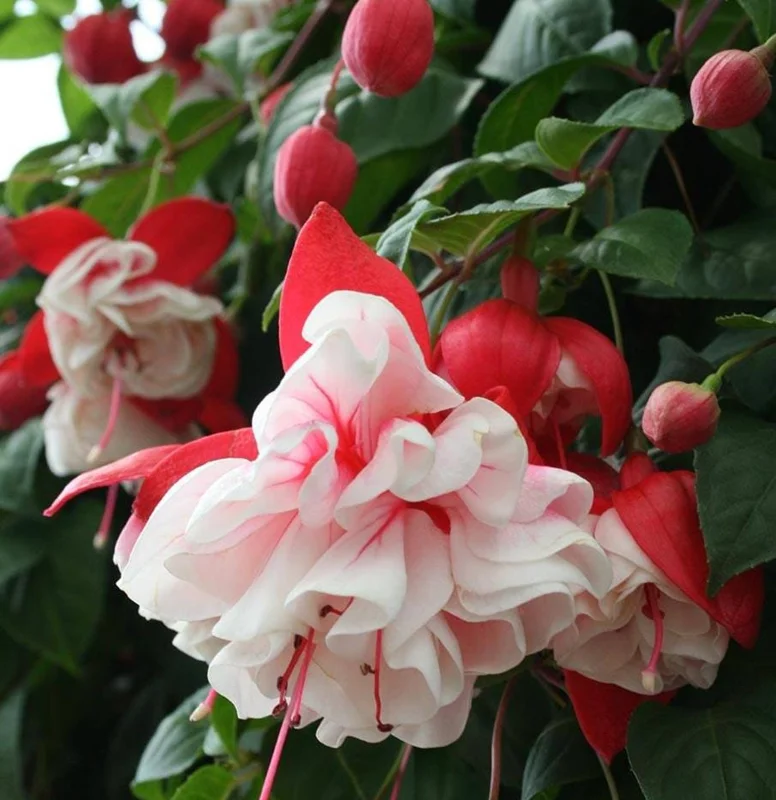 Consistent moisture is crucial for the Swingtime Fuchsia live plant. The soil should be kept evenly moist but never waterlogged, as this can lead to root rot. Water thoroughly when the top inch of soil feels dry to the touch, and ensure good drainage in pots. During hot periods, you may need to water daily. For optimal growth, plant your fuchsia in moist, well-drained, organically rich soil. Amending your soil with compost or other organic matter will provide the necessary nutrients and improve drainage. Fertilize every 2-4 weeks during the growing season (spring through summer) with a balanced liquid fertilizer to encourage abundant flowering. Light pruning to remove spent blooms and leggy growth will encourage a bushier plant and more flowers. This red and white fuchsia is generally hardy in USDA zones 9-11. In colder zones, it can be overwintered indoors as a houseplant or treated as an annual.