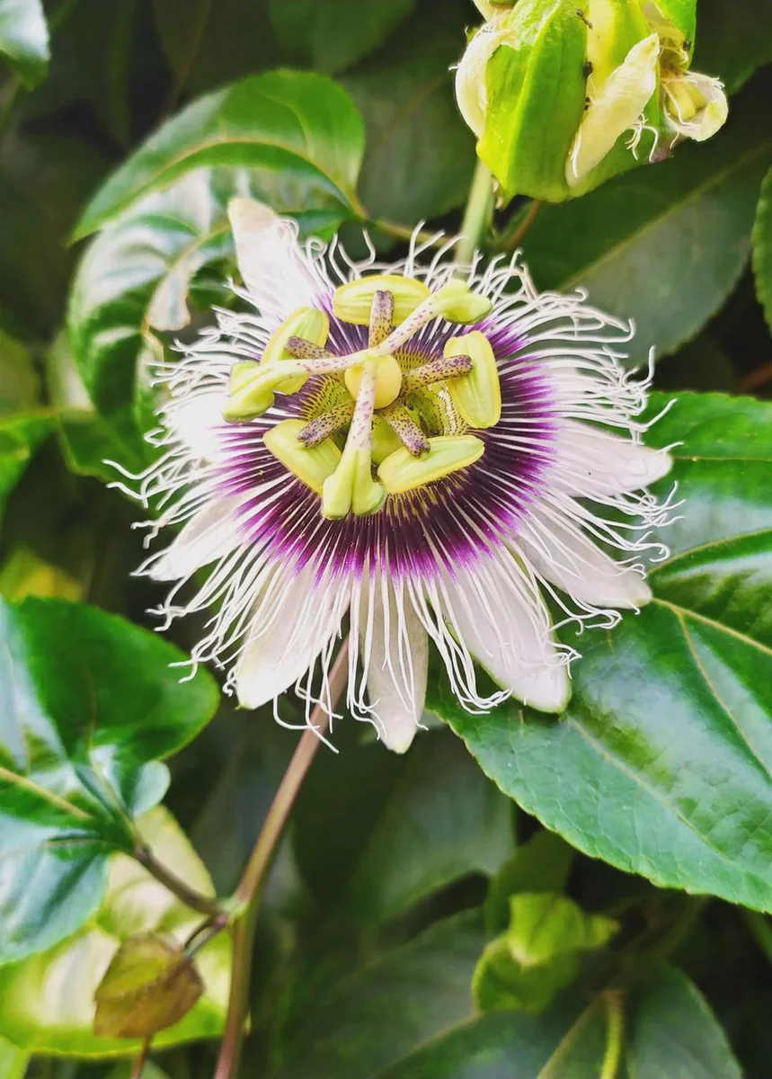 - Stunning Flowers: Before fruiting, the plant produces exotic and intricately designed flowers with white petals and a vibrant, star-like corona of purple and white filaments, attracting pollinators.